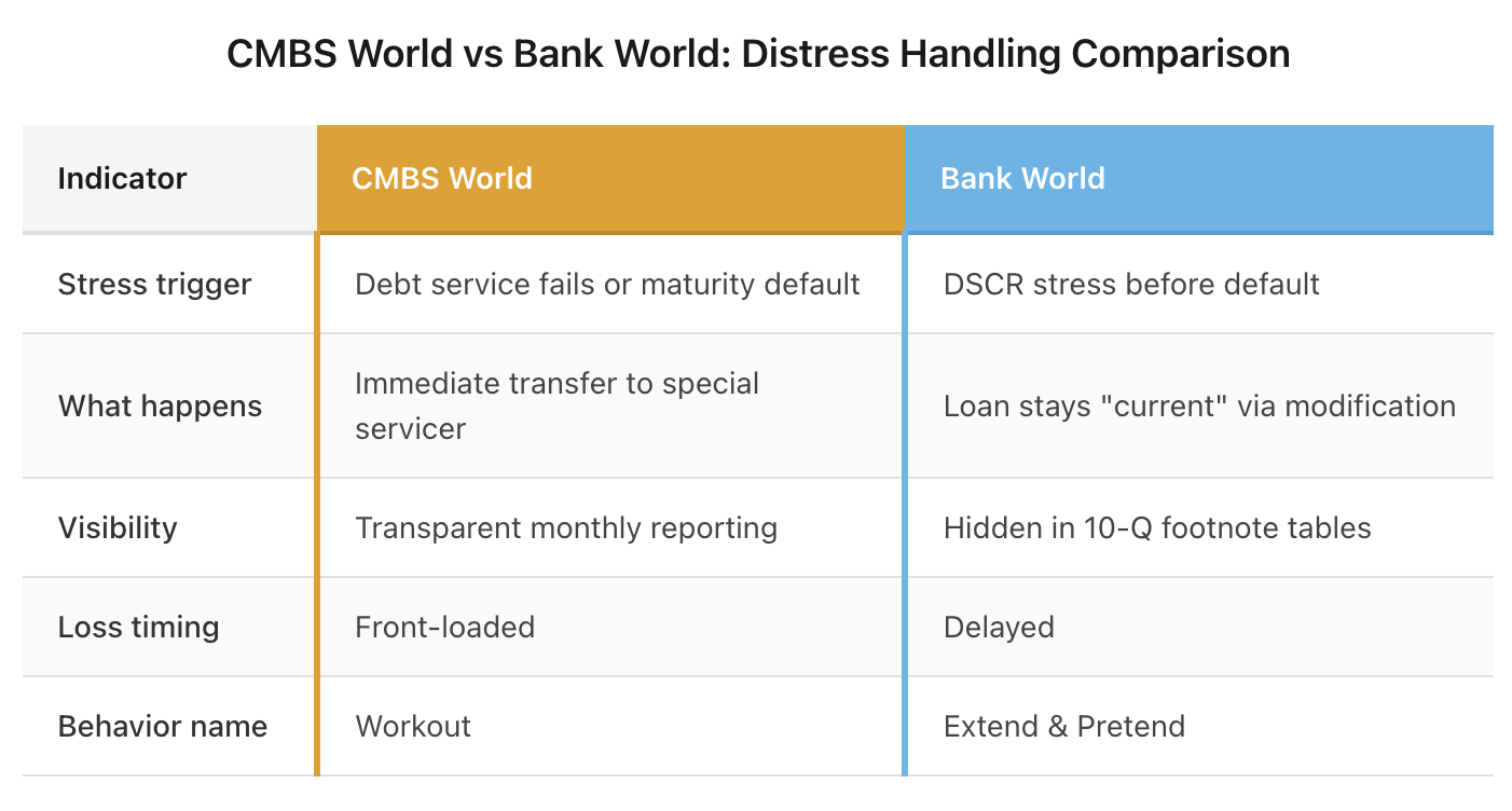 Here’s the side-by-side comparison. The chart shows CMBS credit stress (measured by special servicing rates) next to bank CRE stress (measured by loan modification rates under ASU 2022-02). These numbers are illustrative but economically accurate based on trends from Trepp/Kroll (CMBS) and FDIC/Call Reports + 10-Q disclosures (banks).